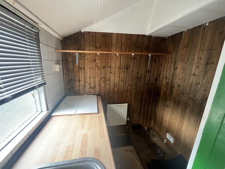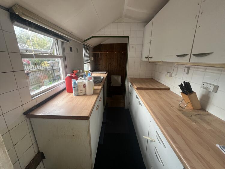 With base and wall units, sink, work surfaces, space for appliances and two windows to side aspect.