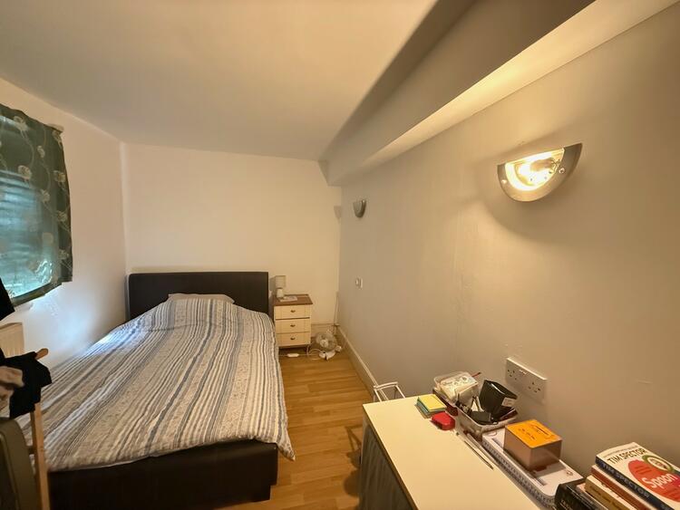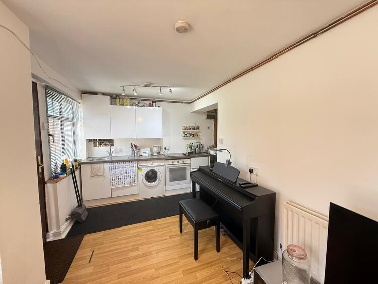 1a - The property briefly includes an entrance into a bay-fronted kitchen/lounge, two separate rooms—one with a bath and the other with a WC and basin—and a double bedroom.