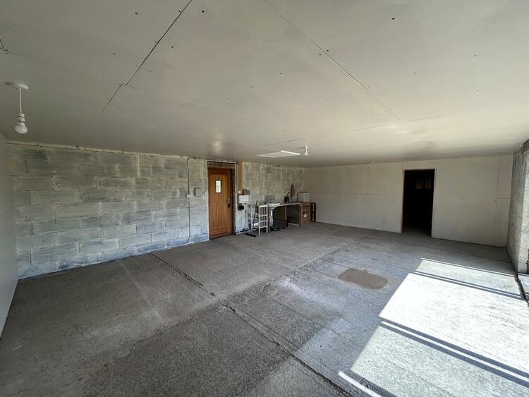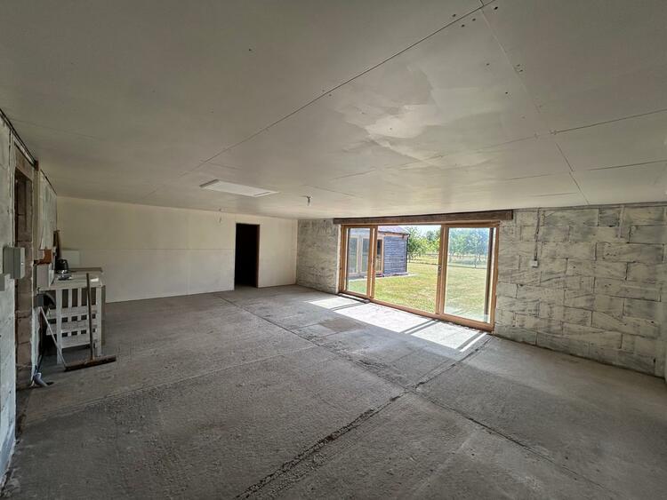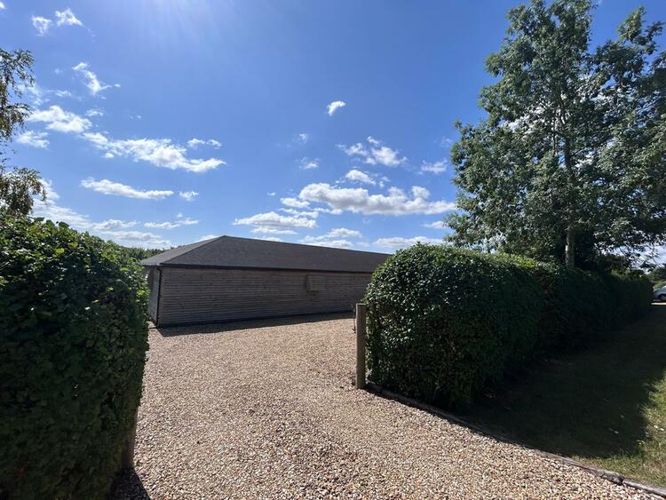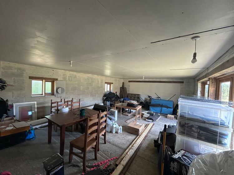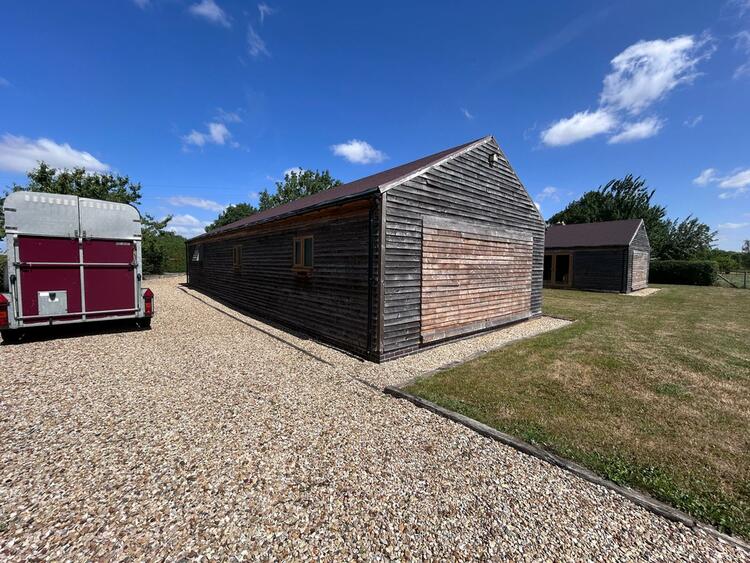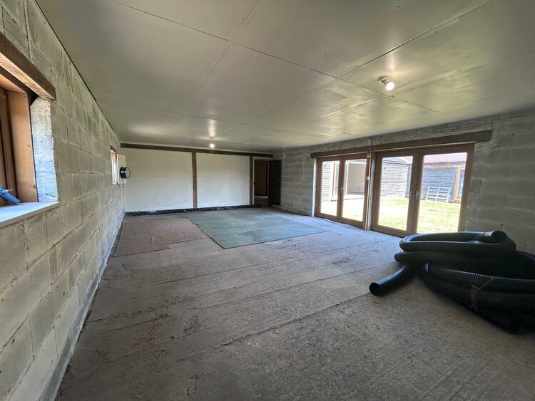 The barn spans approximately 2700 square feet and features UPVC double glazing, multiple sliding and French doors that overlook the plot. Construction is concrete block with timber clad insulated timber frame (100mm PIR) and insulated pre-stressed trussed roof, with OSB board and shingle tiled roofing. Exposed oak beams over windows, doors and internal partitions.