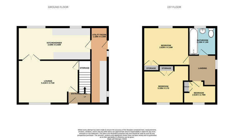 The internal layout briefly consists of an entrance hall, a sitting room, a dining kitchen, a utility room, and understairs storage. On the first floor, there is a landing, three bedrooms, and a bathroom.