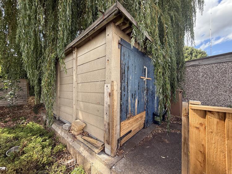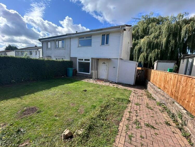 This semi-detached house features three bedrooms and is set on a spacious plot that includes a shared driveway and a detached garage.