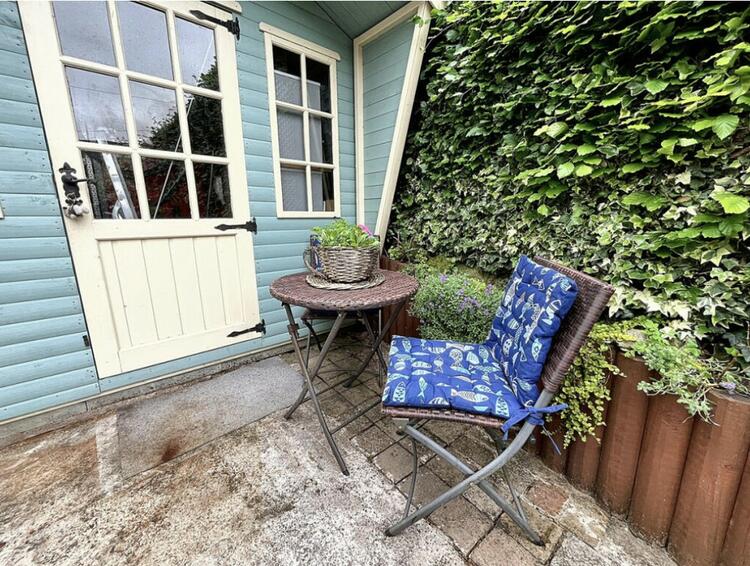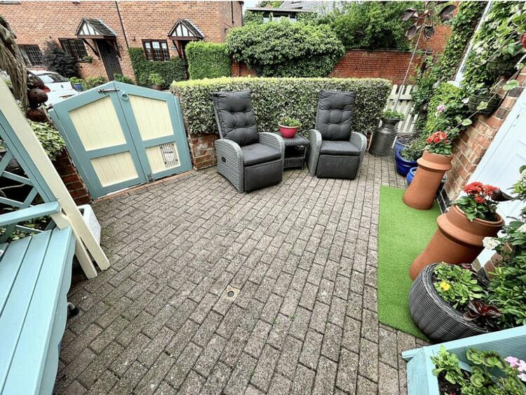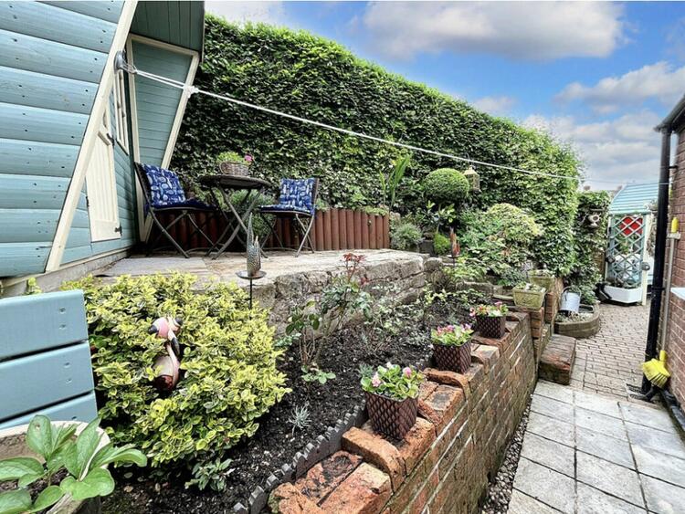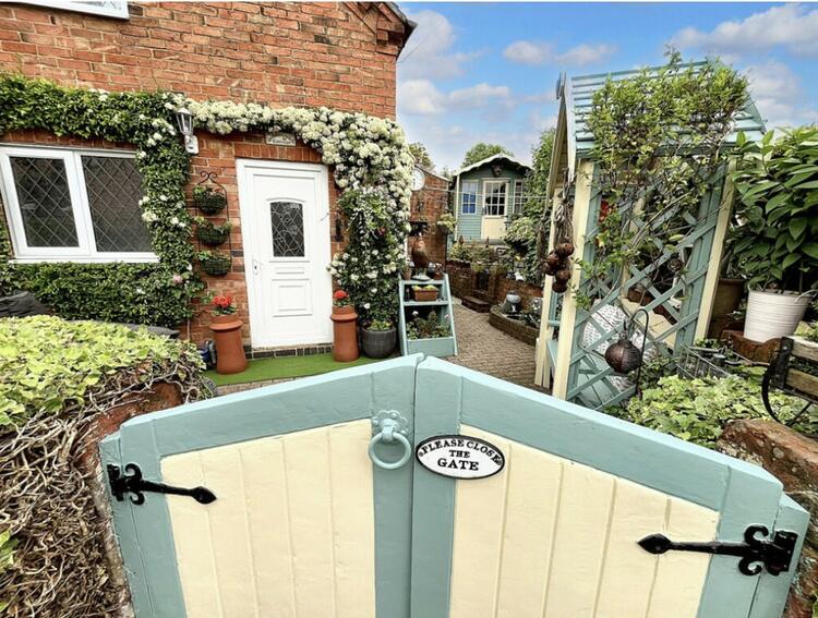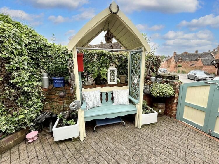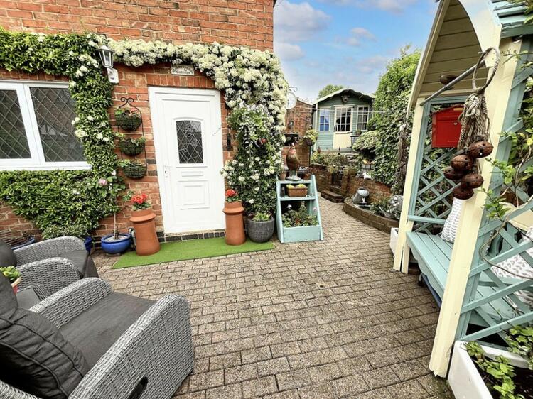 Exterior - The exterior of this pretty cottage is adorned with classic cottage borders filled with plants. The mainly paved garden offers lovely seating areas, perfect for enjoying the outdoors. Steps lead up to a garden shed at the rear, providing additional storage space. This charming property combines traditional character with modern convenience, making it a perfect home in the heart of Church Broughton.