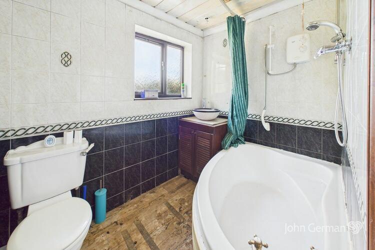 Comprising low flush W.C. wash hand basin and bath with shower over. Window to rear.