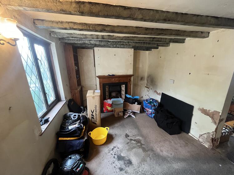 With fireplace with inset gas fire, beamed ceiling, under stairs cupboard, window to front and stairs off.