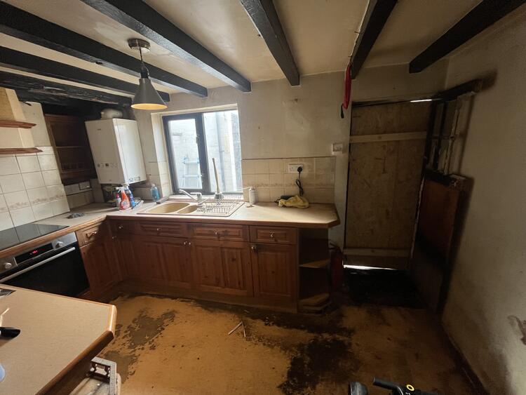 With basic units, sink, oven and hob, work surfaces, wall mounted combi boiler window to rear and door to garden.