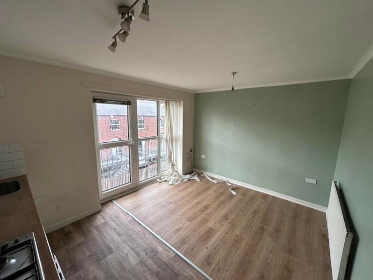 On the second floor is a second double bedroom and a living kitchen area with french doors opening out to a Juliet balcony.
