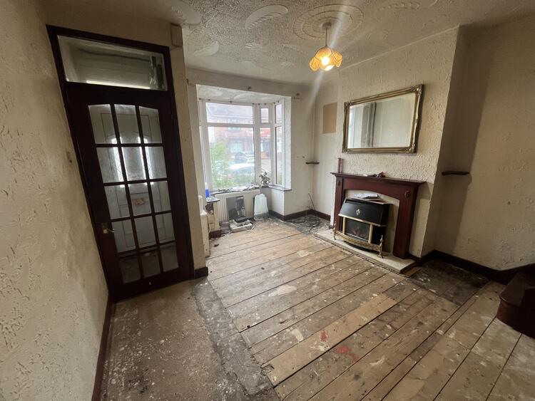 With fireplace with inset gas fire, three radiators, bay window to front, further window to rear aspect and stairs off.