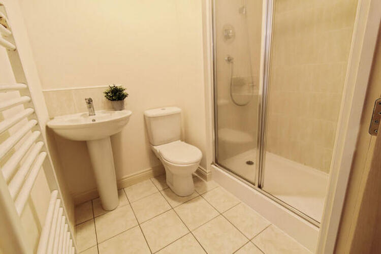 A contemporary ensuite comprising a shower cubicle, low-level WC, wash basin, extractor fan, towel radiator, and tiled flooring.