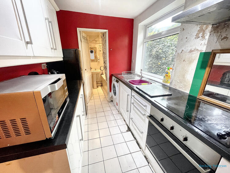 Double glazed window to side, fitted base, wall and drawer units, roll top work surfaces, wall mounted Worcester Bosch combination boiler (installed April 2024).  Built in electric oven, four ring hob, plumbing for washing machine, tiled floor, space for fridge freezer and door to bathroom.