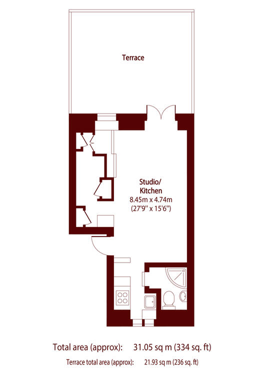 Arranged on the first floor, this impressive studio apartment benefits from intelligently designed storage space, an adaptable use of space, a large private roof terrace and a modern kitchen and bathroom. An extremely efficient use of space and bright interiors make this a desirable apartment.