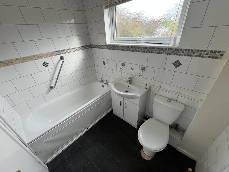 With low flush W.C., wash hand basin and panel bath with electric shower over. Radiator, part tiled walls and window to rear.