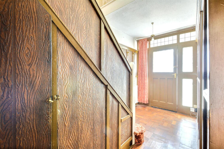 Secondary door through to the entrance hall, with parquet flooring, panelled walls, radiator and access to a useful under stairs storage cupboard.