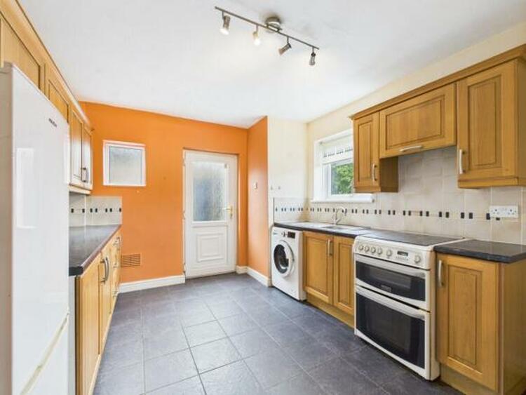The kitchen completes the internal accommodation, offering a range of light wood-effect units featuring curved details and roll-top work surfaces. Practical considerations include space and plumbing for appliances, whilst the gas combination boiler is neatly housed within its own cupboard.