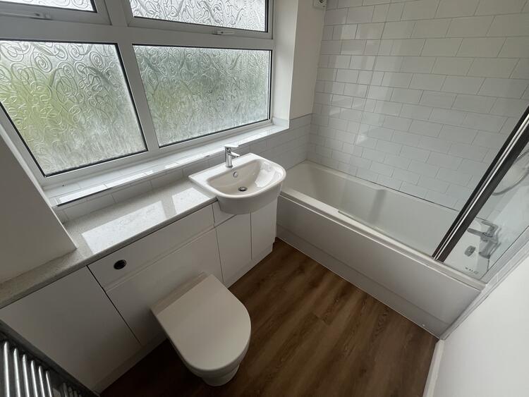 Panel bath with shower over, wash hand basin and close coupled WC. Heated towel rail. Obscure glazed window, tiled walls and laminate wood flooring.