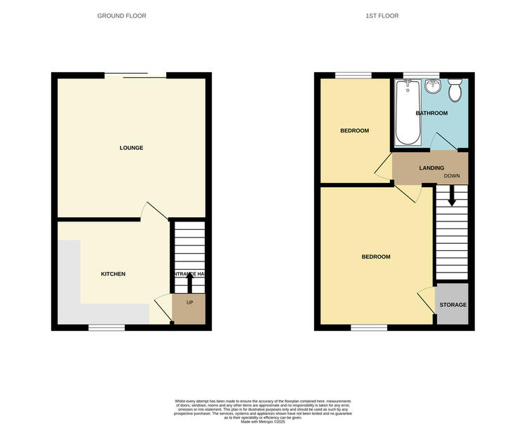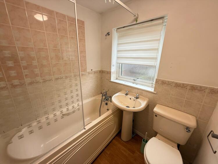 Upstairs, the first floor features two well-proportioned bedrooms, master with built-in storage, and a three-piece bathroom comprising a bath with an overhead shower, WC, and wash basin. Additional storage is available on the landing.