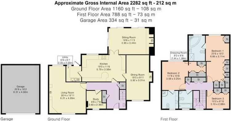 The first floor offers master bedroom with ample storage, an ensuite bathroom with corner bath, wash hand basin and W.C. Bedroom two enjoys a dressing room and ensuite shower room. Bedroom three is also a double bedroom. There is a further bathroom with bath, wash hand basin and W.C.