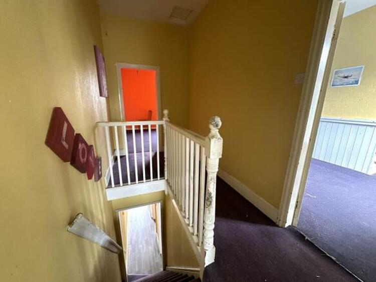 With moulded plaster coving, radiator and staircase rising to first floor.