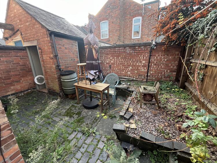 Garden to front with path. Shared side access leads to the rear garden with patio seating area, gravelled borders and brick outhouse/W.C.