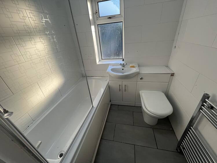 Having low flush W.C. wash hand basin and panel bath with electric shower over. Heated towel rail and window to rear.