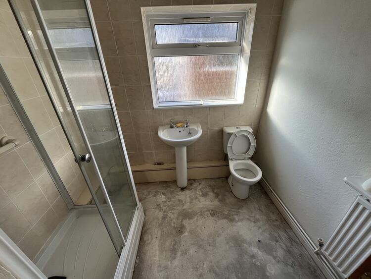 Having low flush W.C., wash hand basin, shower cubicle, radiator and window to side.