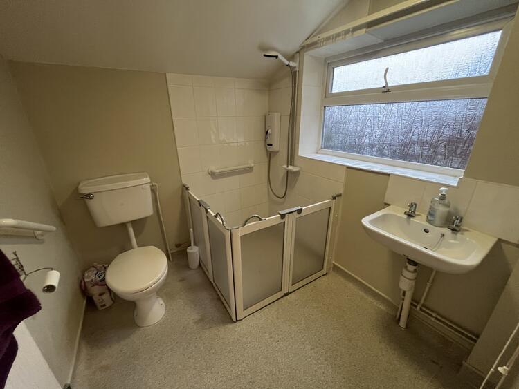 Having low flush W.C., wash hand basin and shower area. Radiator and window to side.