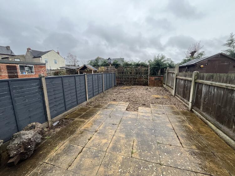 Rear garden with yard area, paved patio, gravelled area and timber shed. Shared rear access.