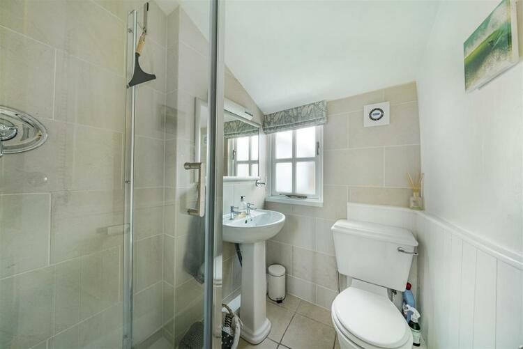 Large mains fed shower cubicle, with rainfall head and tiled surround, pedestal hand wash basin and WC, mirror with vanity light, heated chrome towel rail. Door from entrance hall through to -
