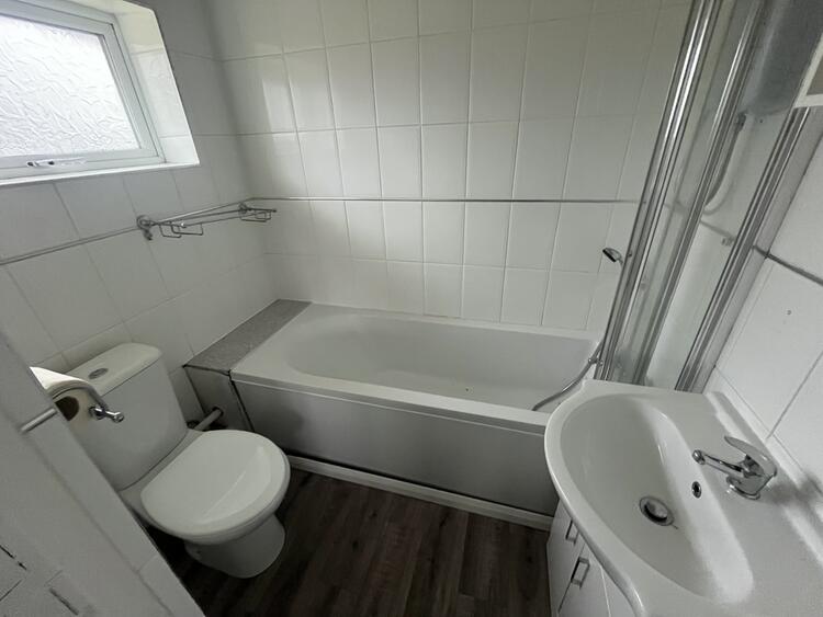 Modern white suite comprising low flush W.C. wash hand basin and panel bath with shower over. Part tiled walls, radiator and window to side. Cupboard housing the Combi boiler.