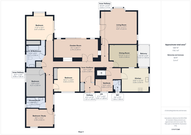 The principal bedroom benefits from direct access to a Jack and Jill bathroom, which also connects to the main hallway. There are three additional bedrooms and a separate shower room with WC. From the vestibule, a convenient lift provides access to the garage, which features an electric up-and-over door, WC, and storage area.