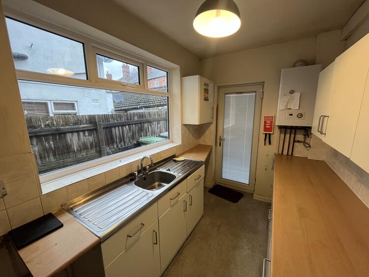Base and wall units, sink, space for appliances, wall mounted combi boiler, window to side and door to rear.