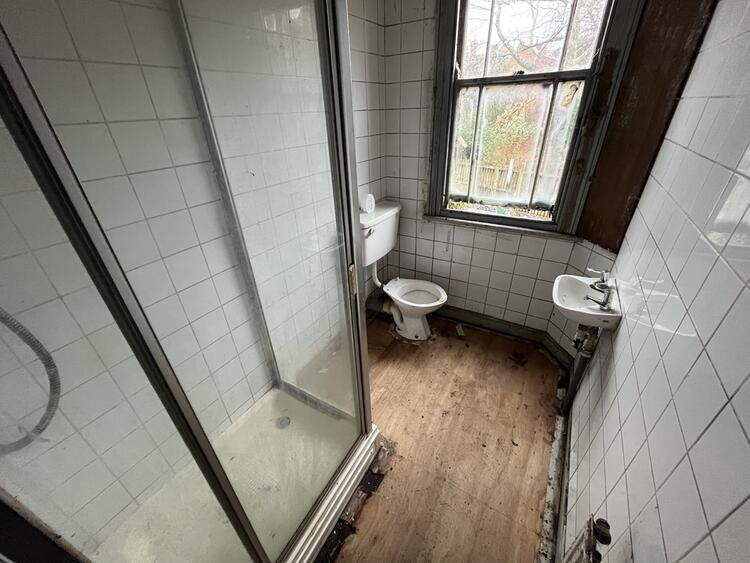 Comprising low flush W.C., wash hand basin and shower cubicle. Radiator and window to rear.
