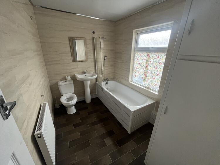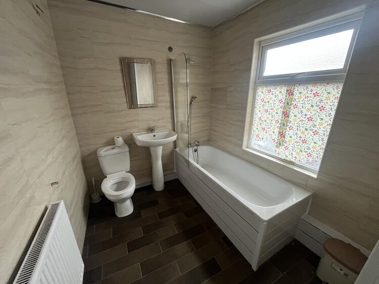 With modern suite comprising low flush W.C., wash hand basin and panel bath with shower over. Radiator, cupboard housing the combi boiler and window to front.