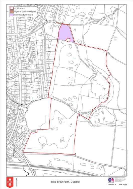 A mixture of park / grassland incorporating a residential development site extending in total to approximately 42.3 acres (17.1 hectares) and forming part of the Cutacre Country Park. The development site in isolation extends to approx 3.4 acres (1.38 hectares) and benefits from approved planning permission for the construction of four executive style dwellings on the site of a former farmhouse which has since been demolished (planning ref 04877/18). Copies of the planning drawings can be found within the legal pack but in brief the completed units would range in size between 3,120 Sq.Ft - 5,145 Sq.Ft and comprise five bedrooms. with garages. The remaining land accommodates a number of public footpaths and is subject to land management plans with further information available upon request and also found within the legal pack. A small parcel of the site, has been planted as a Community Orchard (Shaded purple) and is recommended to be left as is.