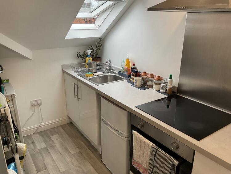 This small kitchen comprises of a sink and drainer unit, wall and base units with counter tops over, Velux window, radiator and laminate flooring.