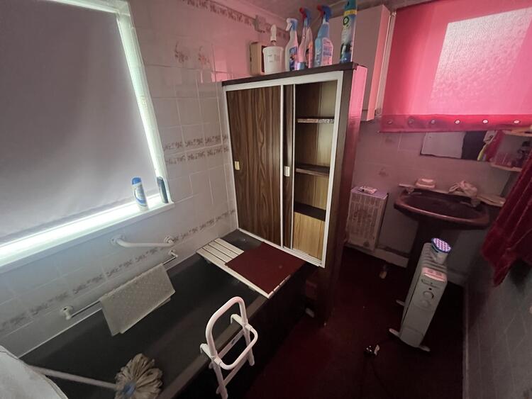 Comprising low flush W.C., wash hand basin and panel bath with shower over. Windows to side and rear.