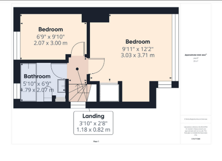 Landing. Bedroom One - 9 ft 11 x 12 ft 2 (3.0m x 3.7m). Bedroom Two - 6 ft 9 x 9 ft 10 (2.1m x 3.0m). Bathroom - 5 ft 10 x 6 ft 9 (1.8m x 2.1m).