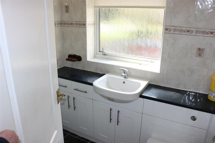 Having modern white suite comprising; wash hand basin in vanity unit with cupboards under and to the side, low-level WC with concealed cistern, and corner quadrant shower cubicle with shower unit, together with tiled walls, UPVC double glazed window, and central heating radiator.