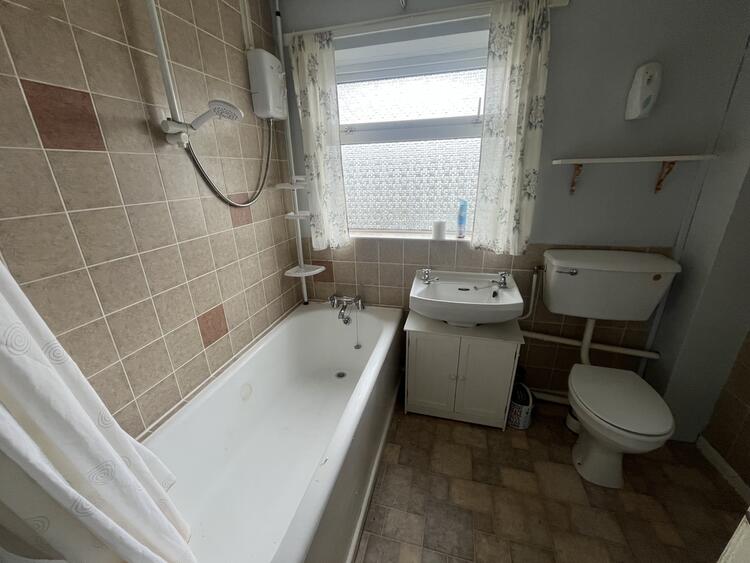 White suite comprising low flush w.c. wash hand basin and panel bath with electric shower over. Window to rear aspect.