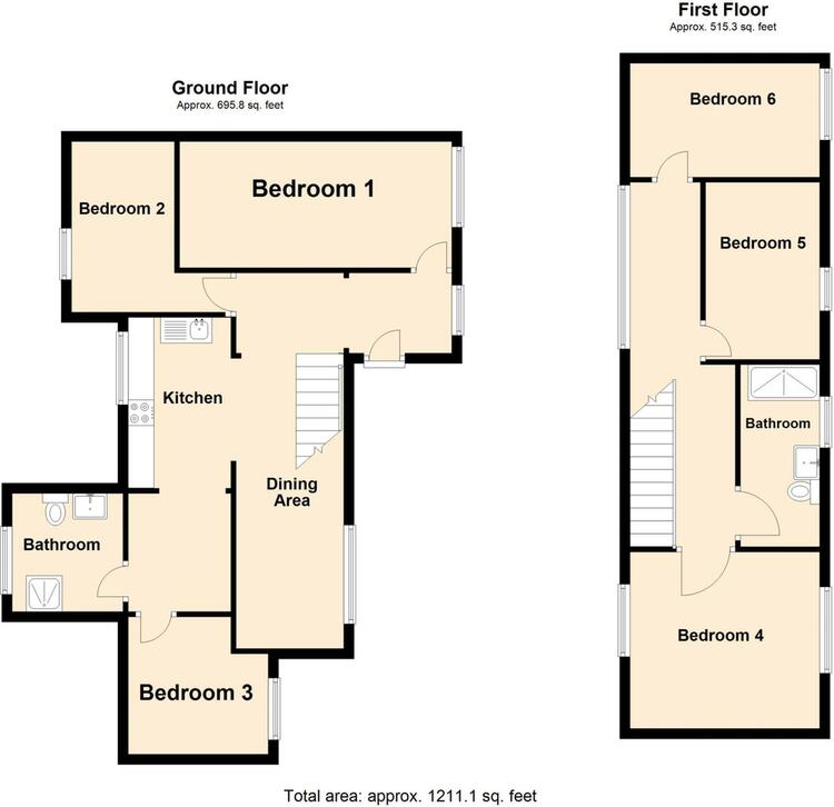 Dining Area - 5.65m x 2.1m (18 ft 6 x 6 ft 11). Kitchen - 3.33m x 2m (10 ft 11 x 6 ft 7). Bedroom One - 2.46m x 5.3m (8 ft 1 x 17 ft 5). Bedroom Two - 3.33m x 2m (10 ft 11 x 6 ft 7). Bedroom Three - 2.68m x 2.73m (8 ft 10 x 8 ft 11). Bathroom One - 2.3m x 2.16m (7 ft 7 x 7 ft 1). Bedroom four - 3.44m x 3.69m (11 ft 3 x 12 ft 1). Bedroom Five - 3.45m x 2.22m (11 ft 4 x 7 ft 3). Bedroom Six 2.22m x 3.69m (7 ft 3 x 12 ft 1). Bathroom Two - 3.55m x 1.55m (11 ft 8 x 5 ft 1)