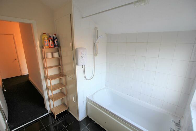 With low flush w.c. wash hand basin and panel bath with shower over. Radiator and window to rear.
