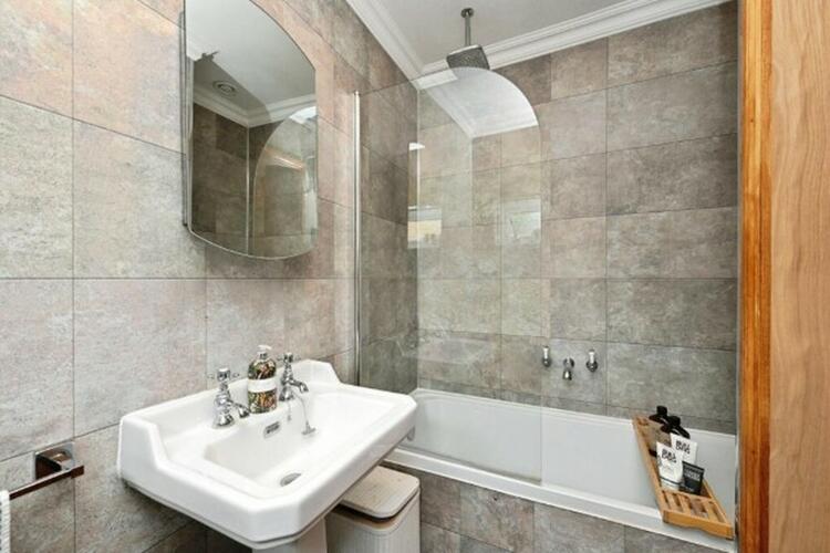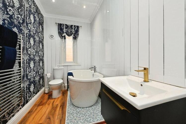 Freestanding bathtub, W.C, hand basin, window to side, heated towel rail.