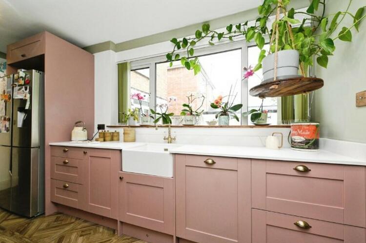 Window to side, space for American style fridge/freezer, butler style sink, open into rear porch area with door to side, door to downstairs bathroom.